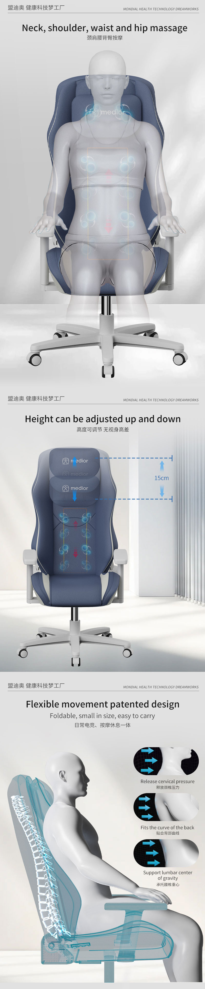 頸部揉捏按摩功能并能順時針和逆時針兩個方向旋轉(zhuǎn)頸部上下高度可調(diào),以適應(yīng)不同使用者的身高。